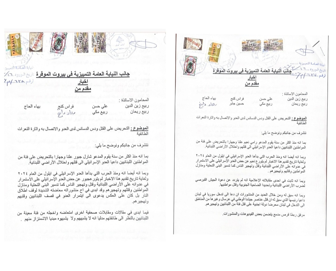 صباح اليوم تقدم مجموعه من المحامين بإخبار بوجه كل من #رامي_نعيم و #شارل_جبور أمام النيابة العامة التمييزية بجرائم التحريض على القتل ودس الدسائس لدى العدو الإسرائيلي وإثارة النعرات الطائفية……