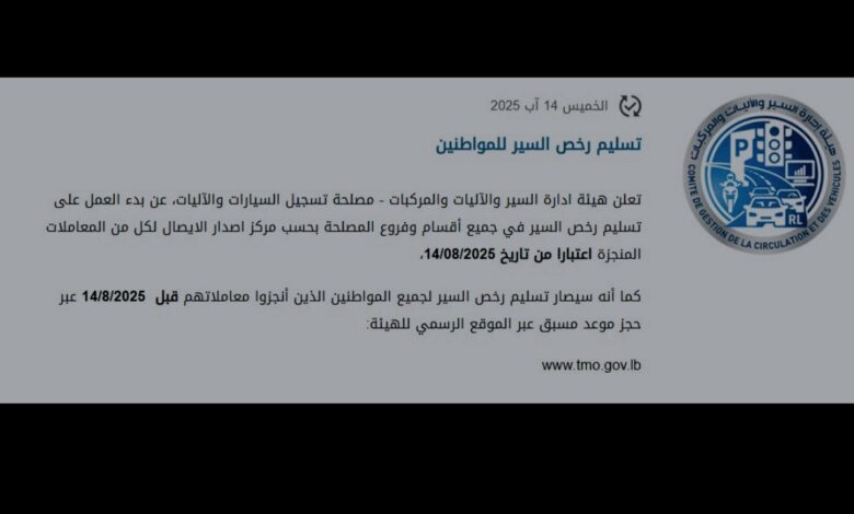 تعلن وزارة الداخلية والبلديات -هيئة إدارة السير والآليات والمركبات عن بدء تسليم رخص السير بحسب مركز إصدار الإيصال للمعاملات المنجزة من تاريخ 2025/08/14 تسليم رخص السير لجميع المواطنين الذين أنجزوا معاملاتهم قبل 2025/8/14 عبر حجز موعد مسبق على منصة الهيئة