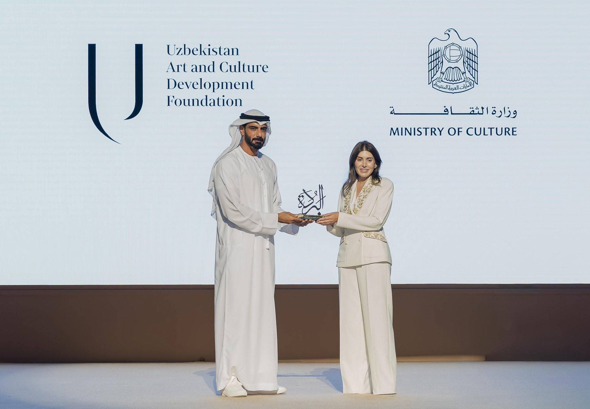 ‏من حفل جائزة البُردة في دورتها 19 برعاية سمو الشيخ عبدالله بن زايد آل نهيان.. وفي عام المجتمع الذي اخترنا فيه “التلاحم والتماسك الاجتماعي” عنوانًا ورسالةً…وبحضور جمهورية أوزبكستان كضيف شرف .. كرّمنا نخبةً من المبدعين الذين جسّدوا في أعمالهم روح الفن الإسلامي في أبهى معانيه.. مؤكدين على دور الثقافة في دعم الحوار الحضاري.